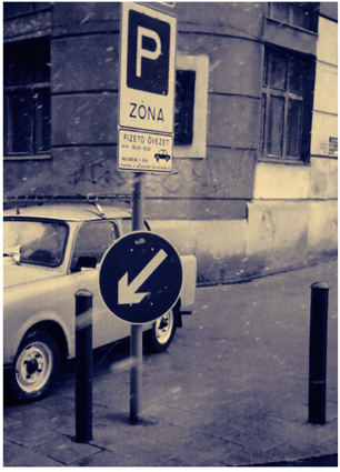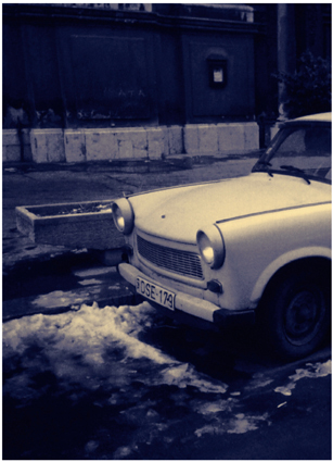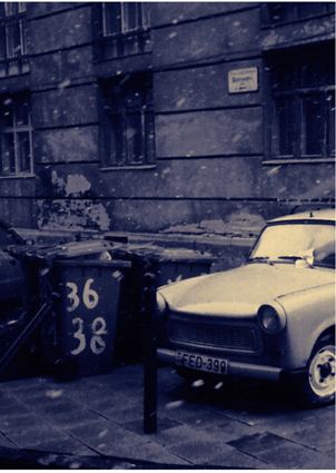 Photographs (black & blue) of Trabant cars in Budapest